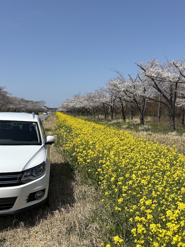 桜菜の花ロード 日常 X Facebook はてブ LINE コピー 2026.04.17 快晴の休日!🚙洗車してドライブ>>> 初めて行って(走って)来ました 桜菜の花ロード 桜はまだまだ満開ではなかったけど・・・ どうですか? 青と黄色とピンク 平日なのに、結構な人が来てましたね〜〜 満開だったら最高だったのに・・・